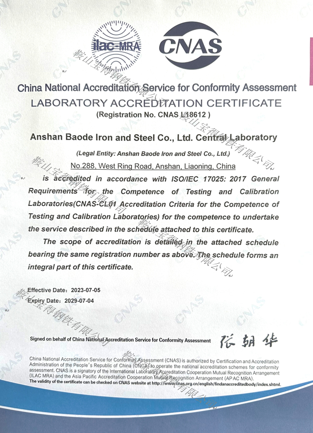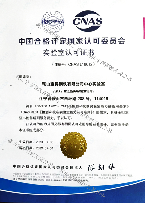 鞍山寶得鋼鐵有限公司中心實驗室獲得